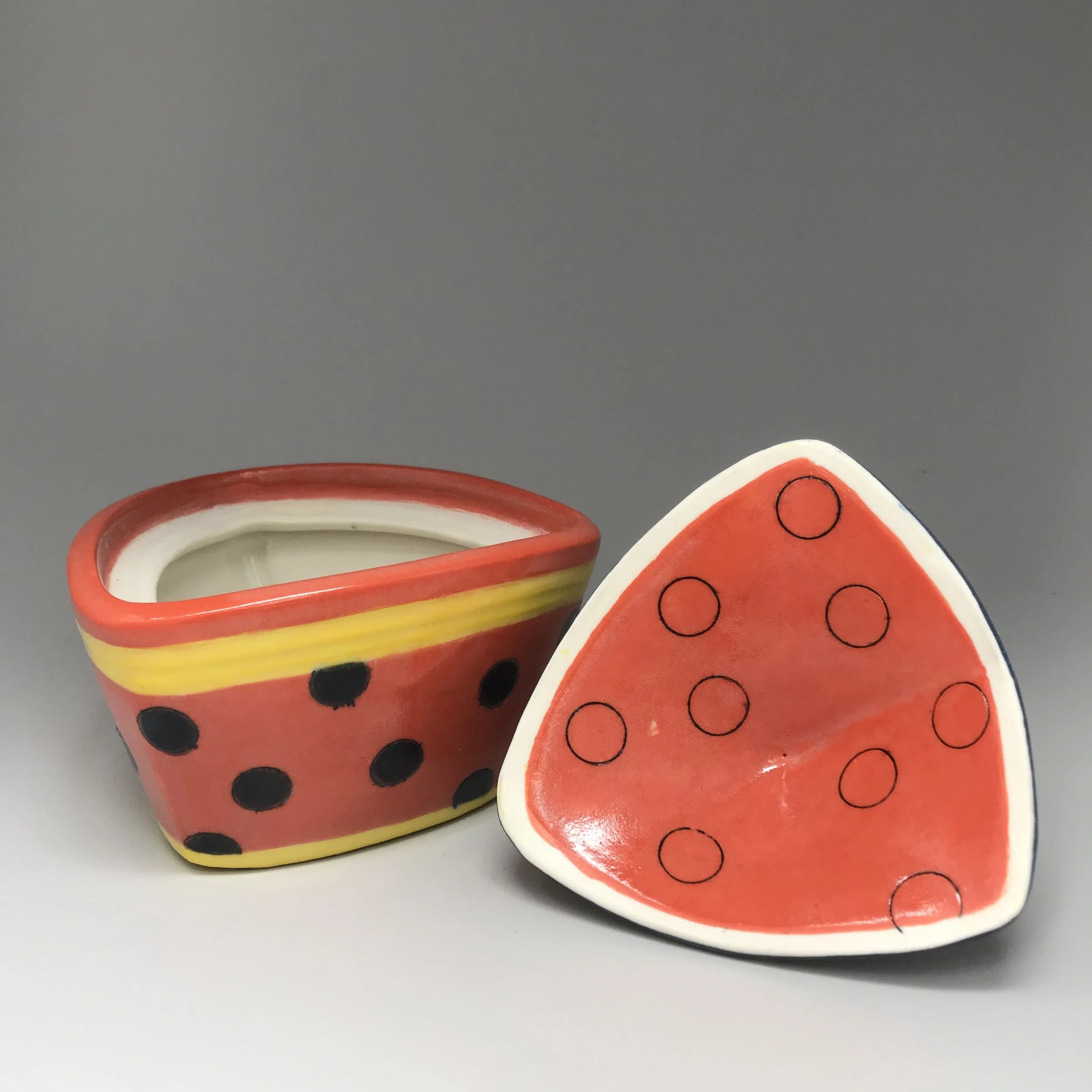 Image 1 of 4 Image 2 of 4 Image 3 of 4 Image 4 of 4 Triangular Lidded Jar, Orange/Blue, Dots and more Dots $150.00 Porcelain, Underglazes, Overglaze5X5X5” Add To Cart Added! Porcelain, Underglazes, Overglaze5X5X5”