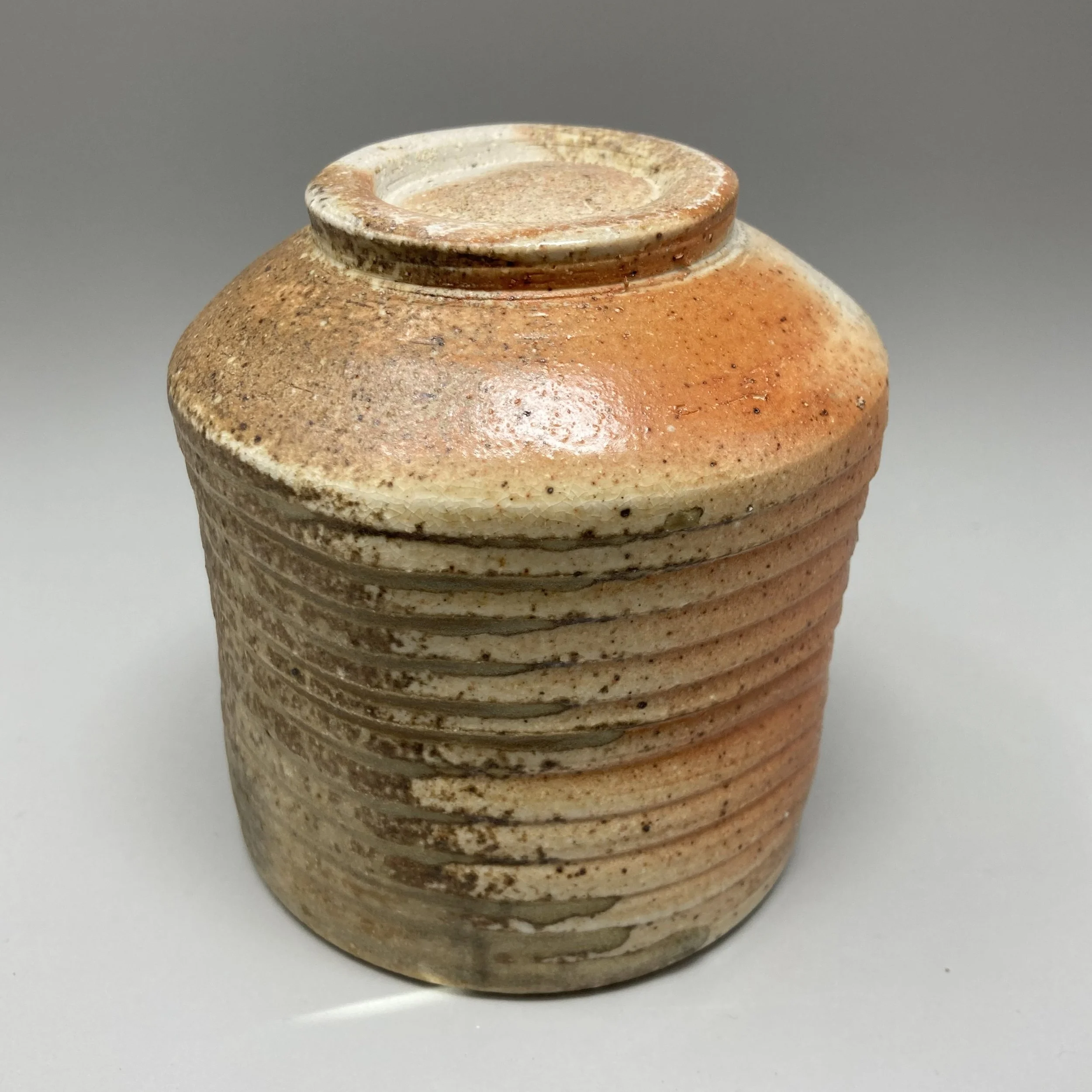 Natural wood-ash glaze from the firing on a white clay body, with shino glaze on the interior of this yunomi-style teabowl. These tea bowls are all of a size that fits perfectly in the hand.