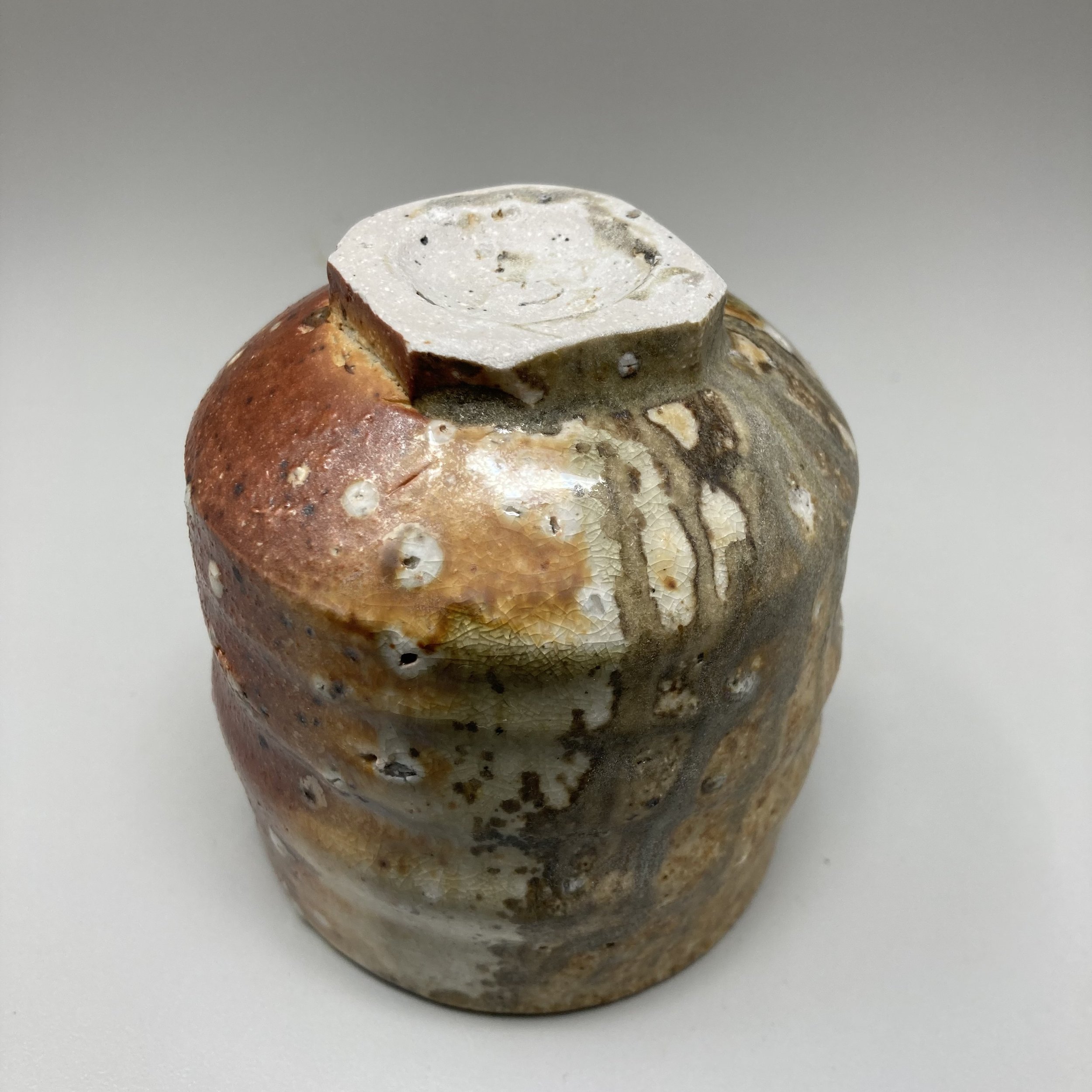 Natural wood-ash glaze from the firing on a white clay body with added felspar chunks. Shino glaze on the interior, with lots of ash on the outside of this yunomi-style teabowl. The foot has been carefully ground to remove wadding that fused with the running wood-ash glaze. These tea bowls are all of a size that fits perfectly in the hand.